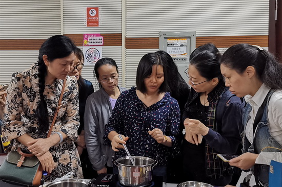 講課結束后,進入膏方現場熬制和體驗環節。本次膏方體驗活動的主角“二冬膏”,是一種傳統膏方,出自明朝洪基《攝生秘剖》,具有養陰潤肺的功效,特別適合秋冬干燥季節服用。二冬膏中僅僅使用了麥冬、天冬兩味中藥,均有清熱滋陰、生津潤燥、潤肺止咳之功,兩藥合用,其功益彰,彰顯中醫配伍理念的獨特魅力。潘高壽的工作人員現場示范如何熬制二冬膏,學員們認真觀看熬制的全過程,積極地問詢,并主動嘗試熬制、試味、分裝。現場到處是學員們體驗非物質文化遺產的喜悅笑容,到處聽到他們對非物質文化遺產喜愛的聲音。