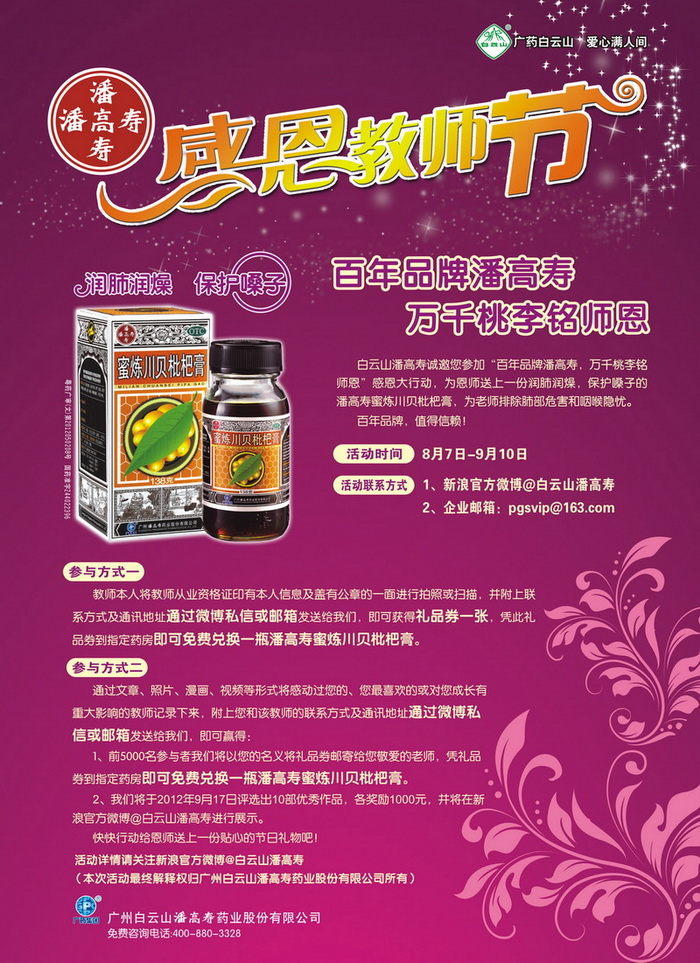 教師本人將教師從業(yè)資格證印有本人信息及蓋有公章的一面進(jìn)行拍照或掃描,并附上聯(lián)系方式及通訊地址通過(guò)微博私信或郵箱發(fā)送給我們,即可獲得禮品券一張,憑此禮品券到指定藥房即可免費(fèi)兌換一瓶潘高壽蜜煉川貝枇杷膏。